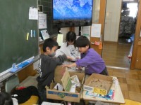 1年生の図工です。紙版画の印刷をしています。初めての版画にどきどきです。