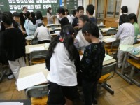 「ねがいましては〜」そろばんの学習です。真剣な眼差しで、そろばんに向かって計算します。指使いや答えが合うと、「やったー!」という声が。素直な3年生です。