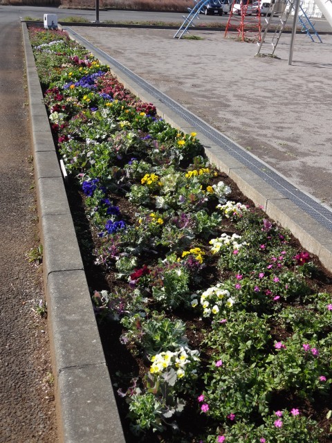 長くて広い花壇が、きれいな花々で彩られています。