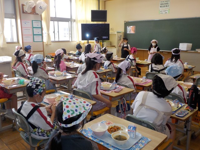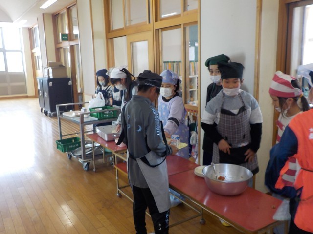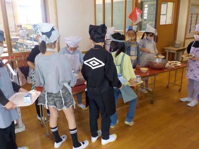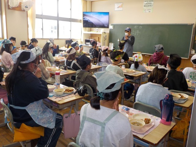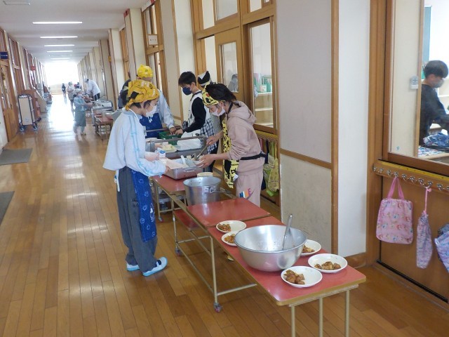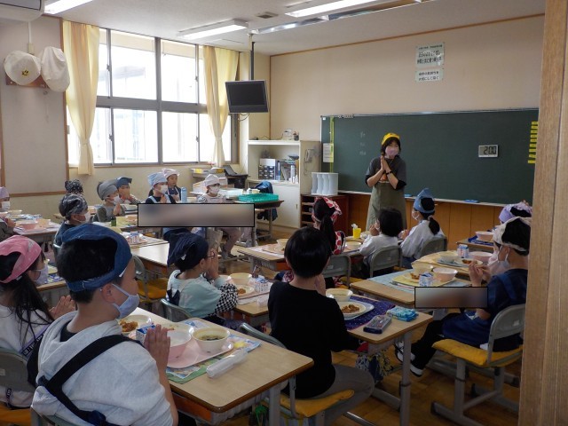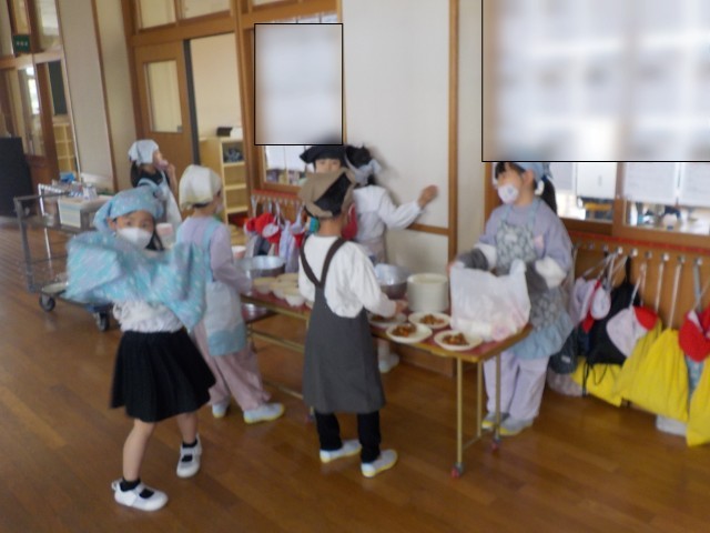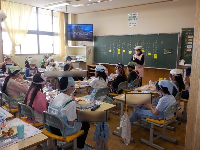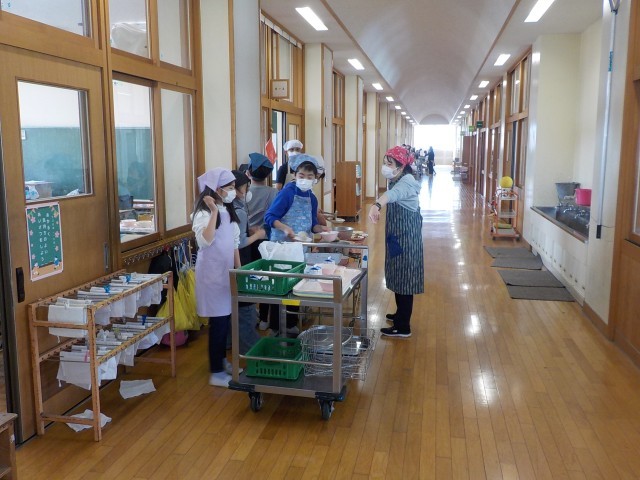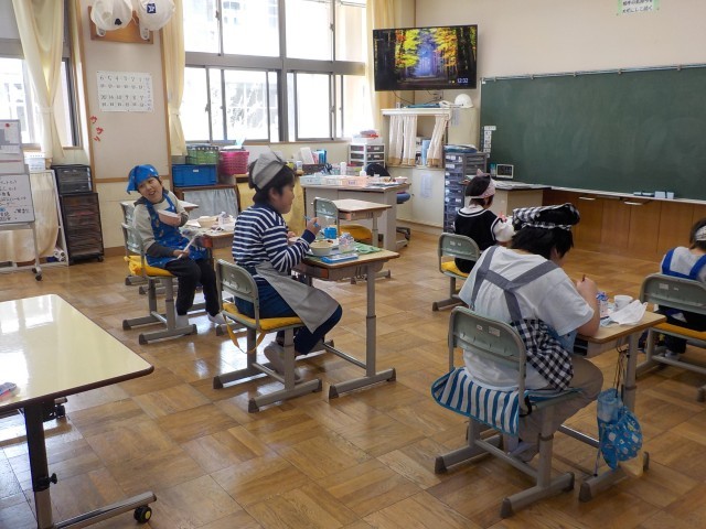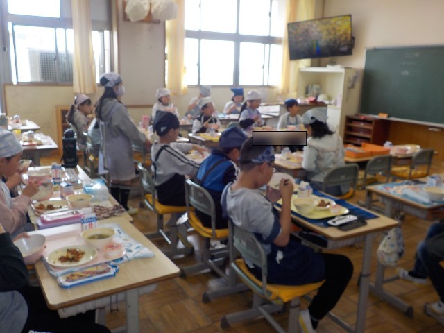 今日から給食が始まりました。ご飯をしっかり食べて、鶏肉の揚げ煮を食べて、リンゴのデザートもおいしくいただきました。