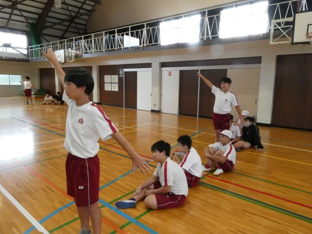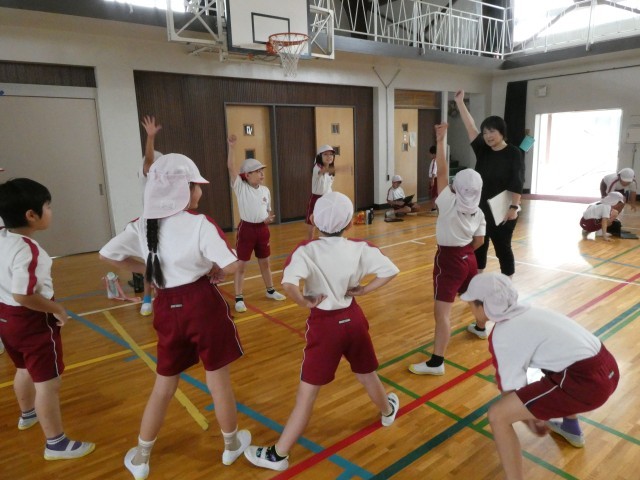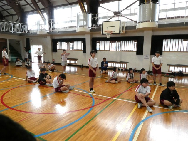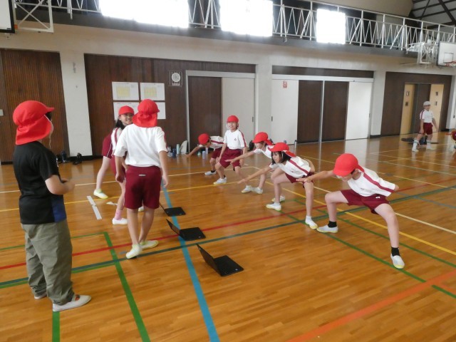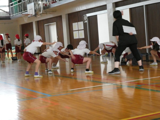 昨年もソーラン節を踊った4年生が、3年生に教えます。まずは、「構え!」の姿勢から。