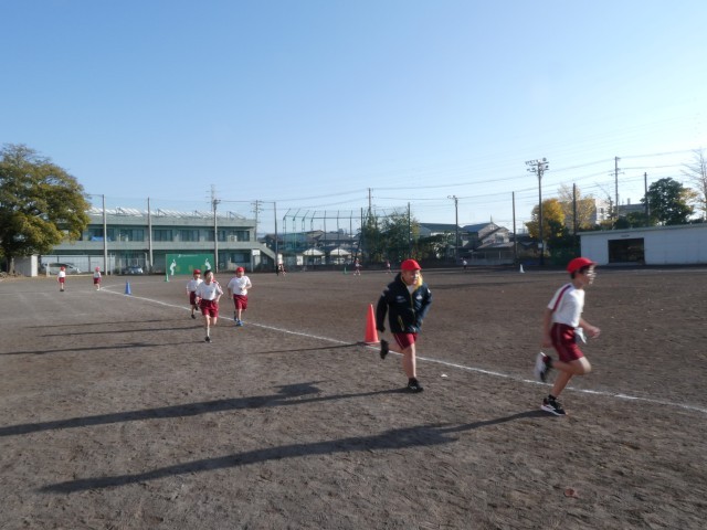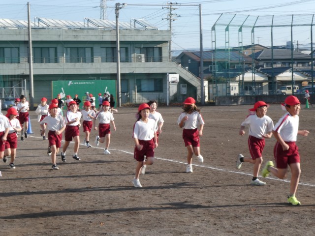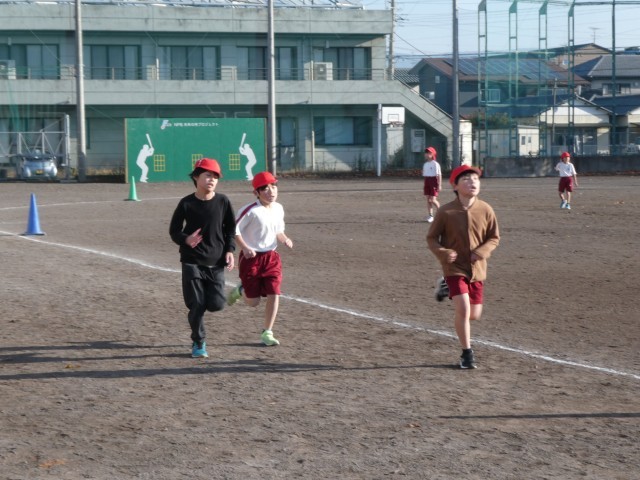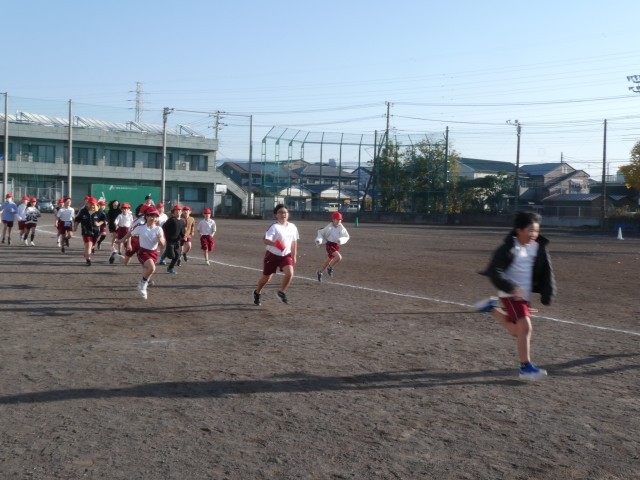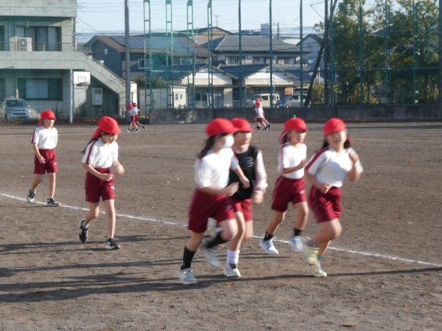 体育の授業の最初に時間走に取り組んでいます。この時間は、3年生と5年生が一緒に走りました。
