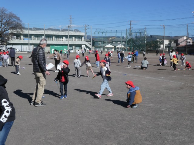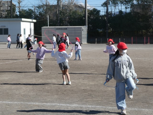 昼休みの様子です。今日は、とても寒い朝でしたが、お日様が出てあたたかな昼休み、子供たちは縄跳び運動に励んでいます。自分の目標の急に向かってがんばれ、がんばれ!