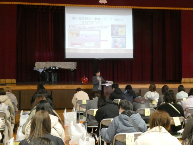 来年度入学の新一年生の保護者に来校いただいて、入学説明会を行いました。心と体の準備を整えて、桜が咲くころ、ぴかぴかの1年生として元気に登校してくるのを待っています。