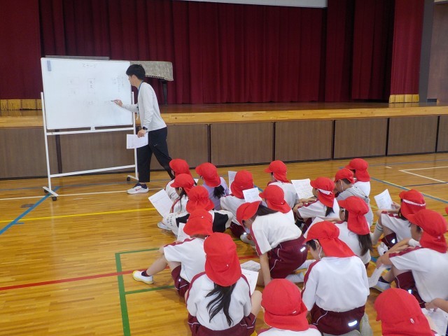 6年生が優しいまなざしで、1年生の活動を見守る姿がほほえましいです。