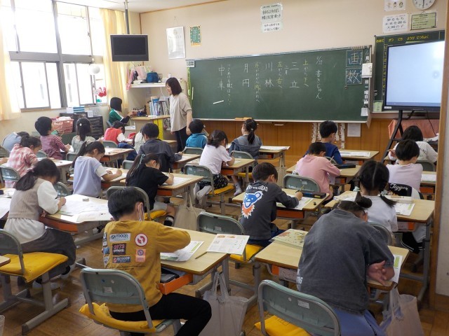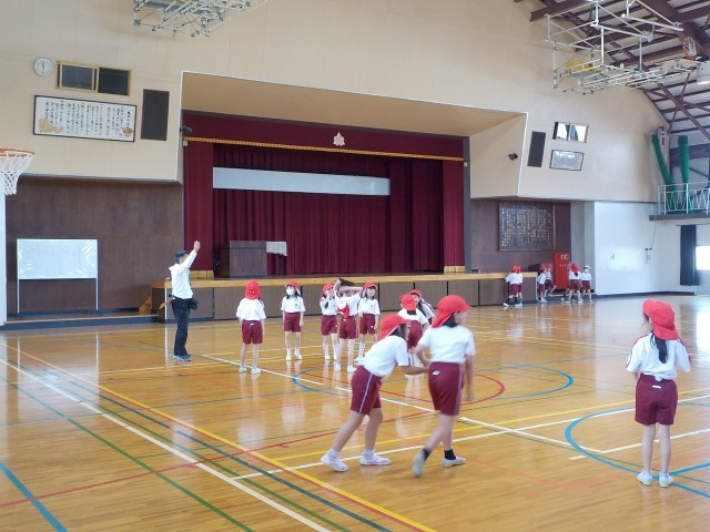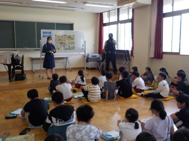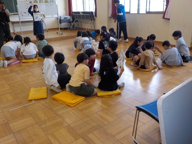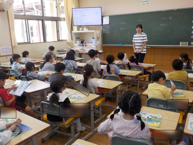 1年生、1組は「1年生を迎える会」について、話を聞いていました。2組は「ドキドキドン!1年生」をジェスチャーを交えながら歌っていました。2年生1組は書写の時間で、漢字の勉強をしていました。2組は体育で、リーダーの動きをまねをするゲームを楽しんでしました。3年3組は「ALSOK」の方に、留守番の仕方について教えていただきました。3年2組は算数で、自分の考えと友達の考えを比べていました。3年1組は国語の授業で、「意味調べ」について先生の話を聞いていました。