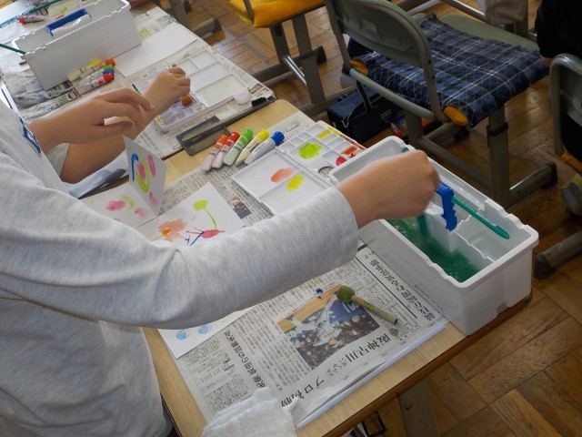 4年3組は、表とグラフの違いを見つけていました。4年2組は習字の授業が終わったところです。4年1組は図工で、いろいろな模様を作って楽しみました。