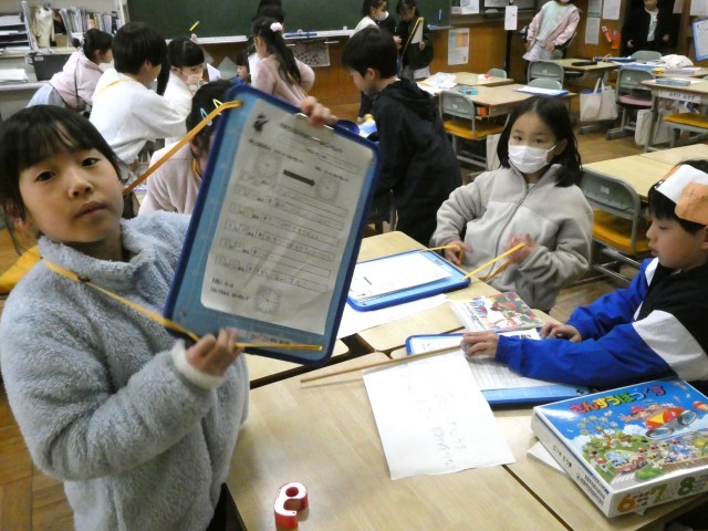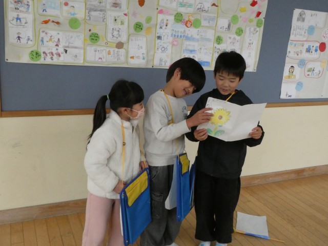 こちらのクラスも、休み時間返上で準備をしています。「何しているの?」と聞いたら、どの子もしっかり相手や目的について教えてくれました。りっぱな1年生、もうすぐ2年生です。