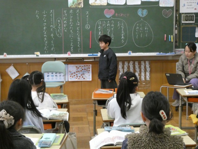 「スイミー」を読み進めています。場面の様子について、友達と対話しながら考えていました。