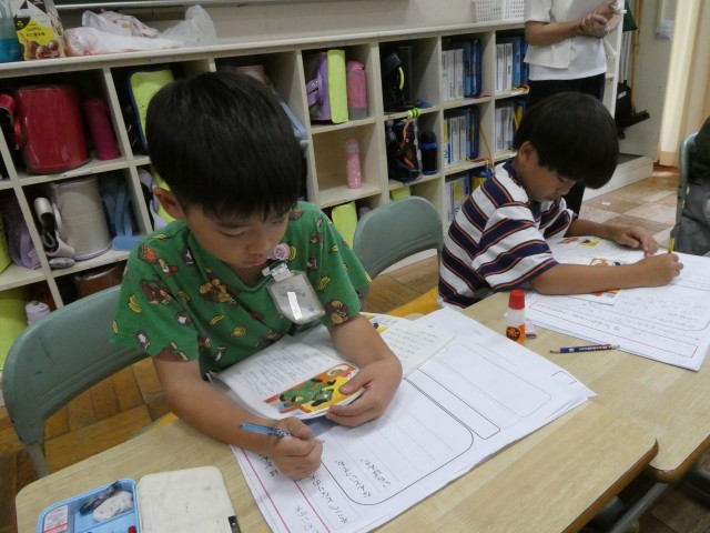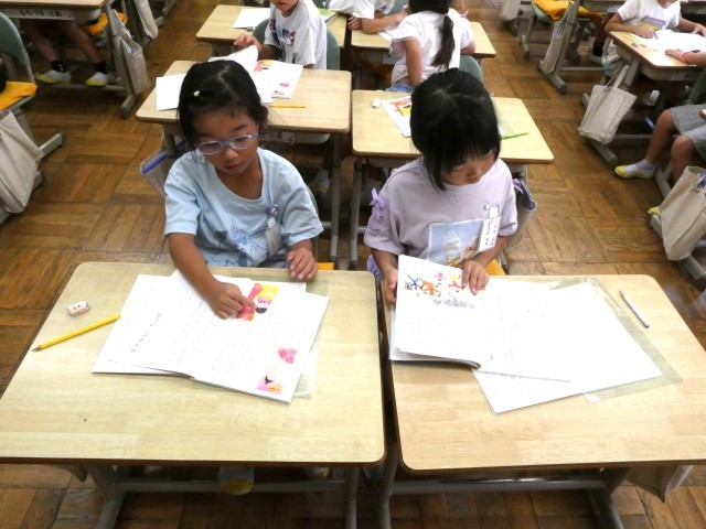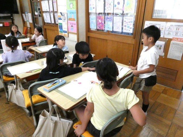友達と絵日記を読み合いました。夏休みにどんな思い出ができたのかな? 絵と文章でかいたことをお互いに読み合って感想を伝え合っていました。