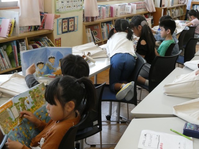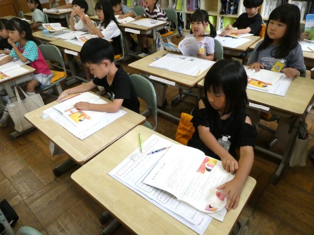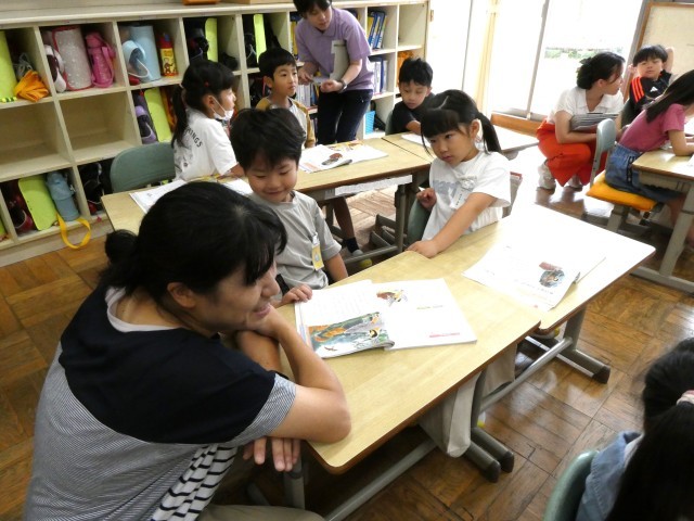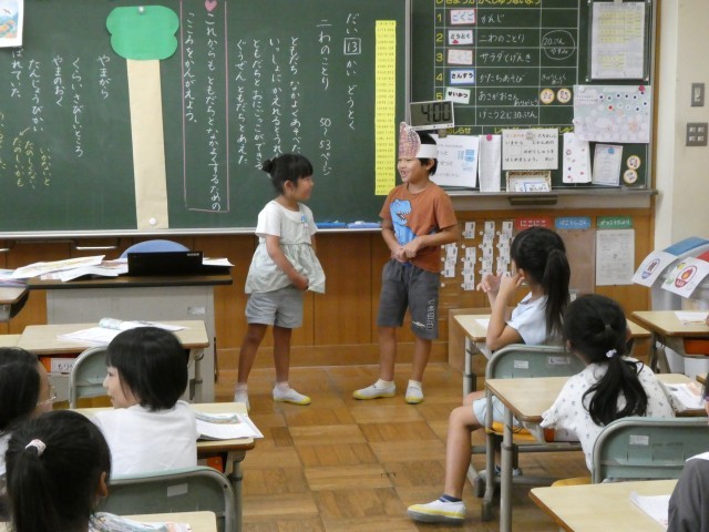 「二わのことり」というお話を読んで、友達と仲良くするにはどんな心が大切なのか考えました。入学して半年、1年生の成長を感じました。友達が話すときは、自然にみんなの目がその子に集まります。聴く態度にやさしさが表れています。
