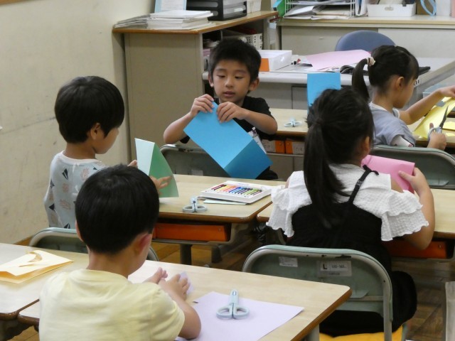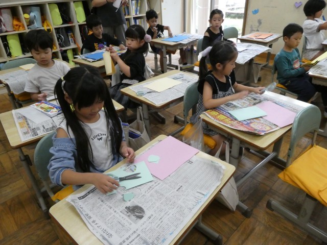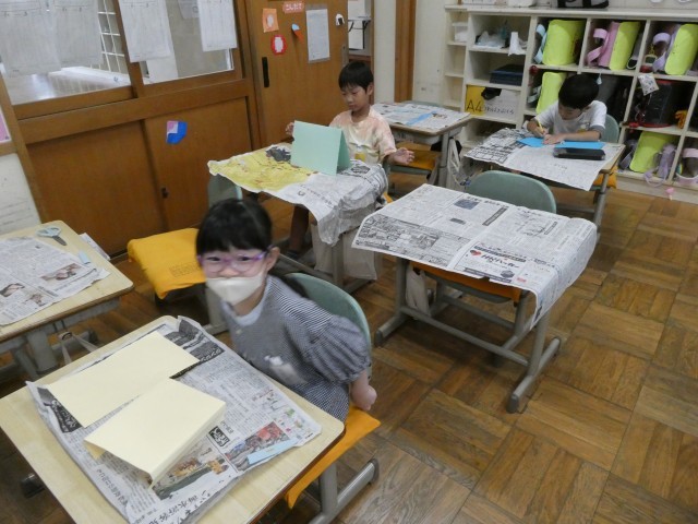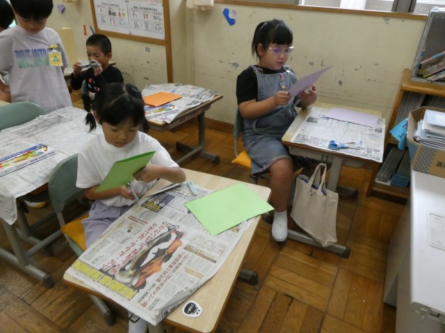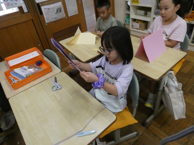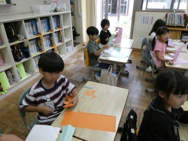 おって、たてて、なにつくろう? はさみを上手に使って作成中!