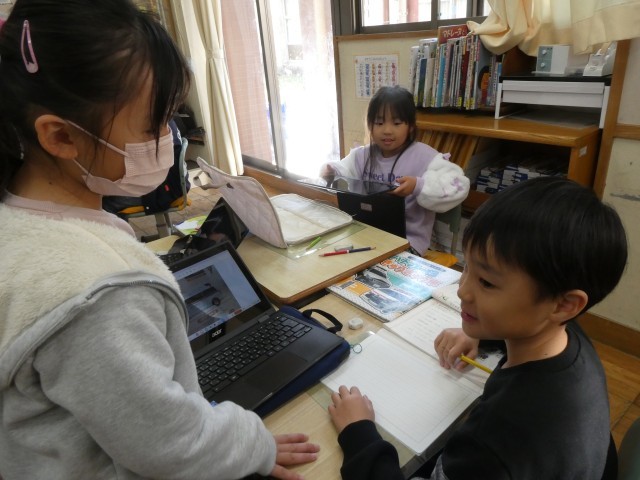 はたらく船についての説明文を読んで、「はたらき」や「しくみ」が書かれていることが分かりました。自分で「はたらく車」の本を読んで、興味を持った車の「はたらき」や「しくみ」を書き抜いて、カードを作ります。本の冊数に限りがあるので、見たい本のページを写真に撮ってじっくり読んでいました。