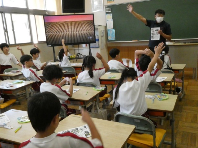 「やさいのひみつを見つけよう」野菜に栄養があることは知っているけれど、あまり好きではないという子が多いようです。野菜には、派を食べるもの、茎を食べるもの、根を食べるものがあることを学びました。根の野菜を水に入れてみると・・・沈むこともわかりました。いろんな野菜を食べてみようという気持ちがわいてきた授業でした。