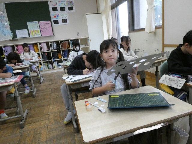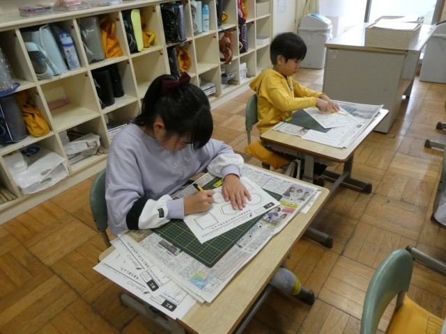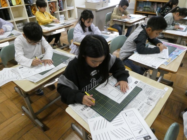 図工でカッターを使った工作をするので、まずは、カッターの使い方を練習してみました。初めての道具、慎重に使っています。