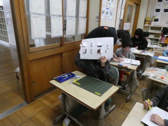 カッターナイフの使い方が少しずつ上手になってきました。自分の好きな形の窓を切り抜いて、顔をのぞかせて見せてくれました。
