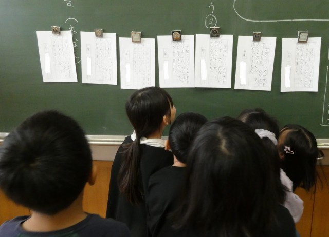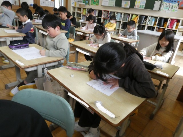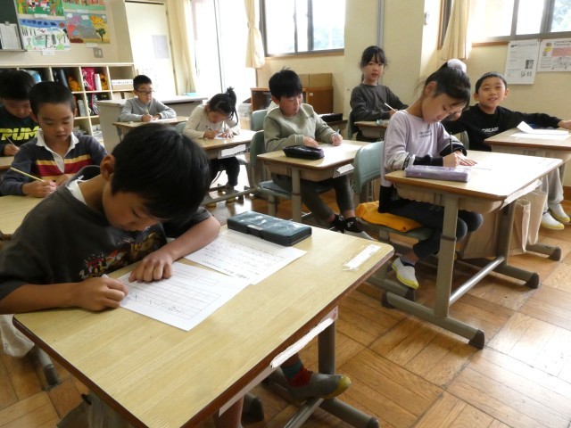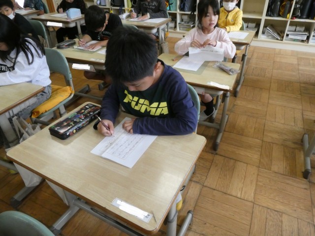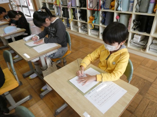 どの子も姿勢を正して、ゆっくり鉛筆を進めています。今日は、「そり」と「まがり」に気を付けて書きました。