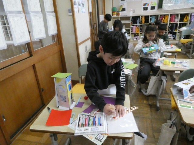 図工でカッターを使った工作をするので、まずは、カッターの使い方を練習してみました。初めての道具、慎重に使っています。