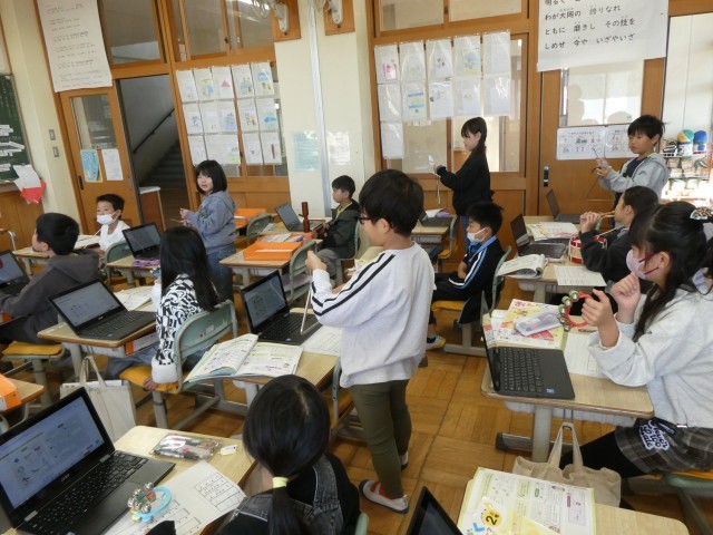 熊手図を使って、大切な人を多面的に紹介する学習です。友達に話を聴いてもらって、大切な人のいろいろな面がうまく伝わるかどうか評価し合いました。