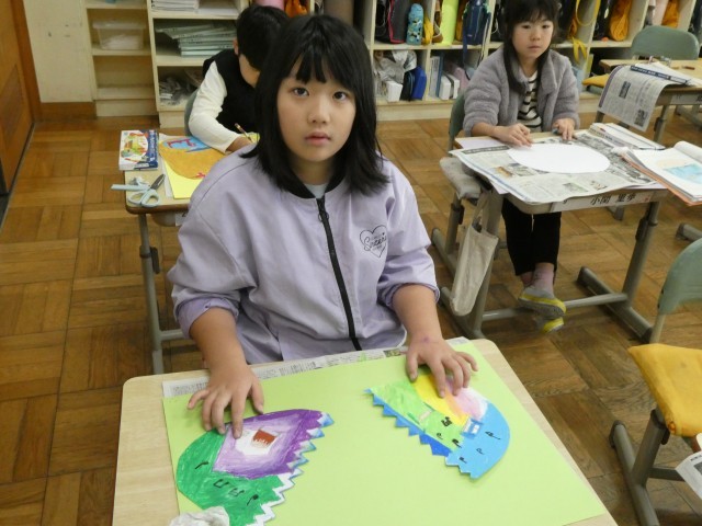 熊手図を使って、大切な人を多面的に紹介する学習です。友達に話を聴いてもらって、大切な人のいろいろな面がうまく伝わるかどうか評価し合いました。