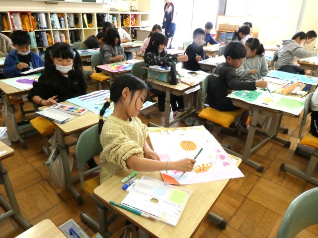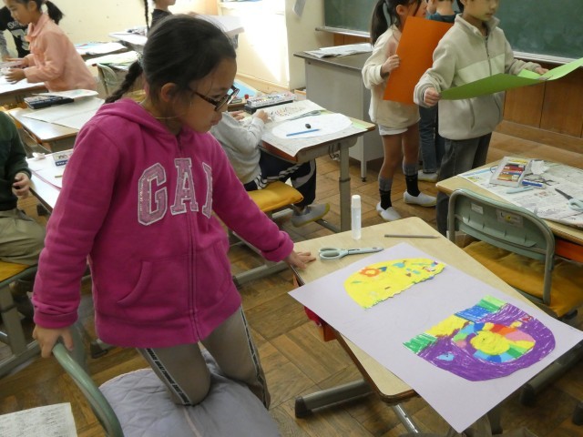 2年生の図工では、カッターナイフを使って窓の部分を切り抜く作業を行います。