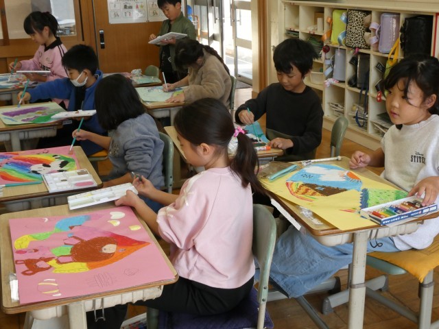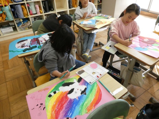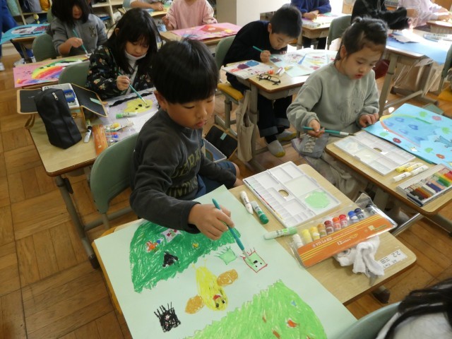 たまごの中からいろいろな世界が広がります。絵の具も使って楽しそうに表現していました。