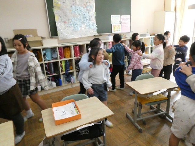 みんなで楽しくじゃんけん大会。勝つと前に進んで次の人とじゃんけんぽい!