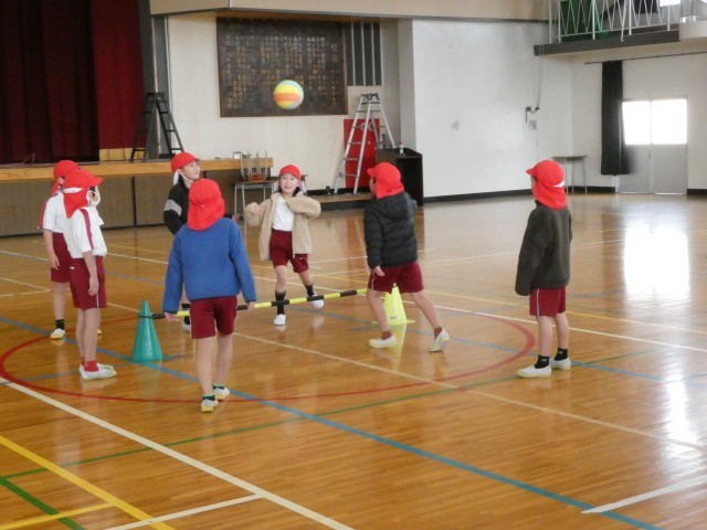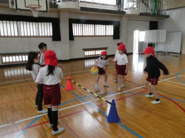 プレルボールをやっています。ボールをバウンドさせて、仲間同士で回し、相手コートに返します。