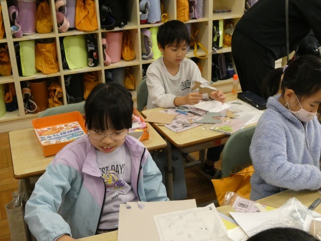 釘打ちトントン、金槌の使い方も少しずつ上手になってきました。作品ができあがった子は色を塗っています。