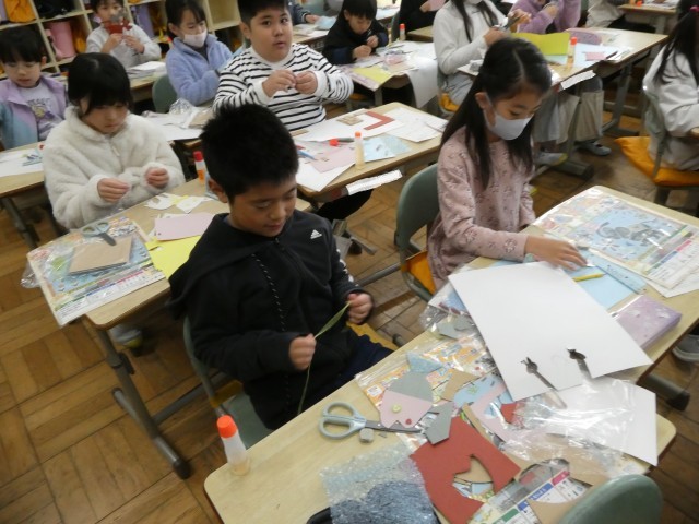 「ひもでつないで」図工室が不思議な世界になっていました。友達と対話しながらの共同作業です。