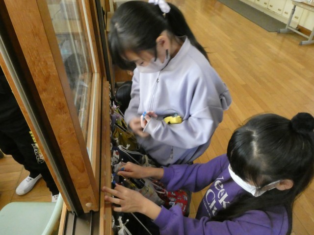 「ひもでつないで」図工室が不思議な世界になっていました。友達と対話しながらの共同作業です。