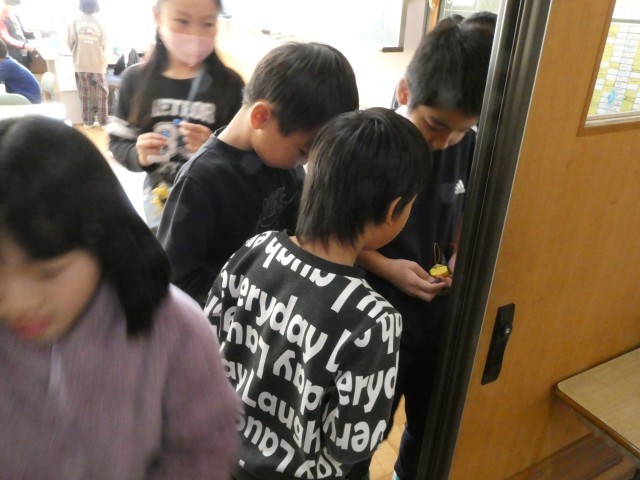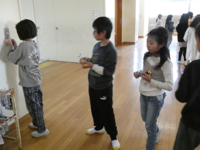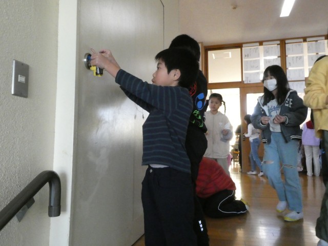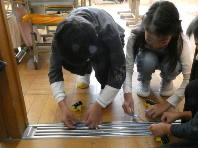 電気を通すのはどんな物だろう? 金属だろうと予想した子供たち、教室のまわりの金属っぽい物を片っ端から確かめていました。