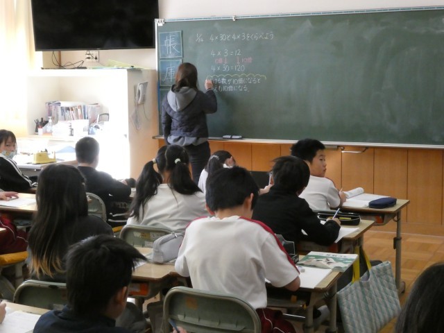 かける数を10倍すると、答えも10倍になると確かめた子供たち。「言いたいことがある!」と手が挙がりました。「かけられる数も10倍したらどうなるの?」それを考えてみようと言うことになりました。