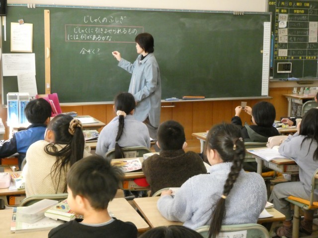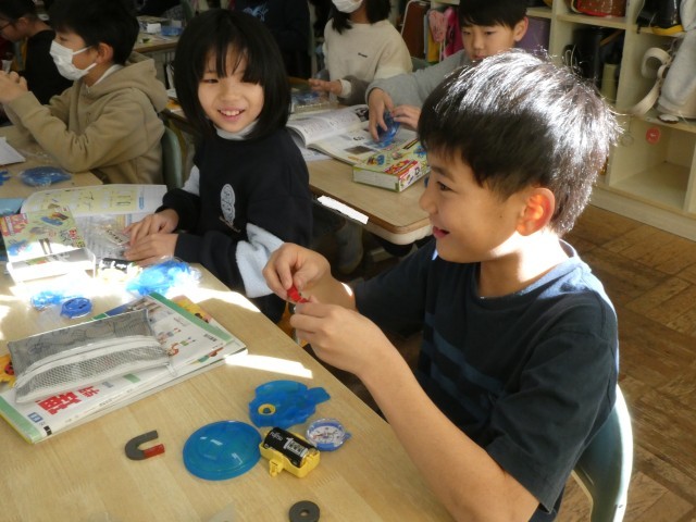 じしゃくってどんなもの? 「鉄にくっつく」「砂鉄がくっつくよ」生活体験から、知っていることを話しました。磁石に引き寄せられるものはどんなものだろう? 問いを立てて調べてみることにしました。