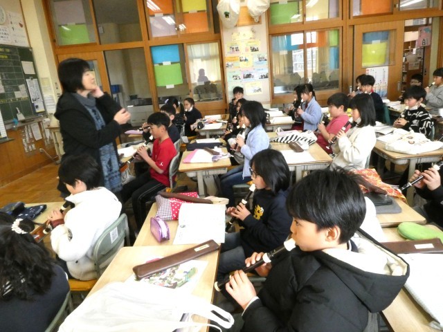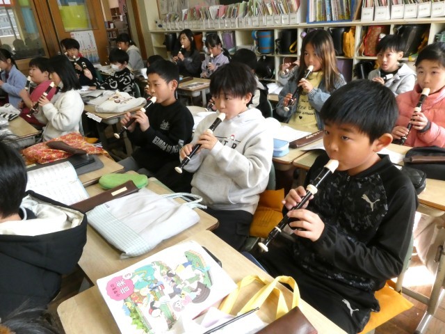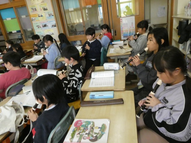 「エーデルワイス」のリコーダー演奏に入る3年生、先生が、映画「サウンド オブ ミュージック」の一部分を見せてくれました。音楽ってすてき! そんな気持ちで学習が進められるといいですね。