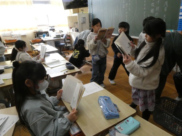 教科書に載っている「ゆうすげ村の小さな旅館」のような不思議な感じがする物語をいくつか紹介したところ、「読みたい!」「続きが気になる~」と立ち読み会が始まりました。