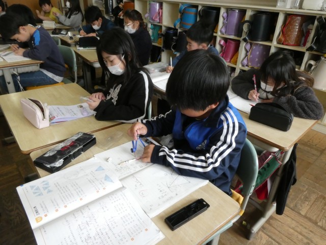 どちらのクラスも算数の復習に取り組んでいました。1年間、様々なことを学んだので、忘れそうになっている知識もあります。くっくと取り組む姿、友達に助けを求める姿、頭を抱えながらも頑張っている姿、どれも頑張っている姿です。