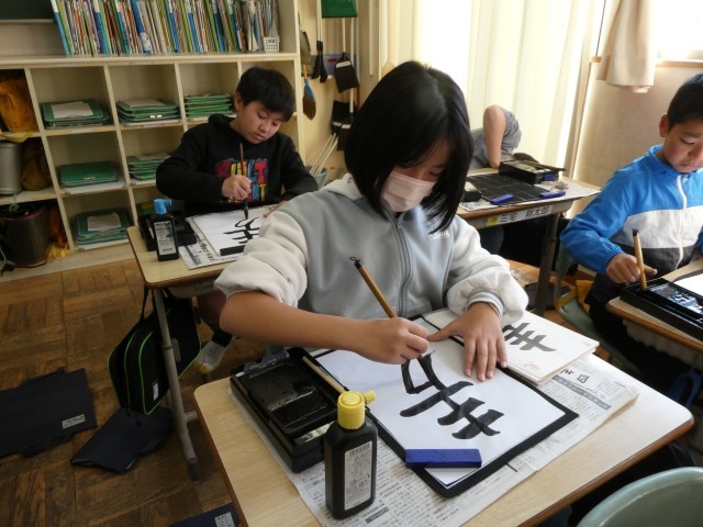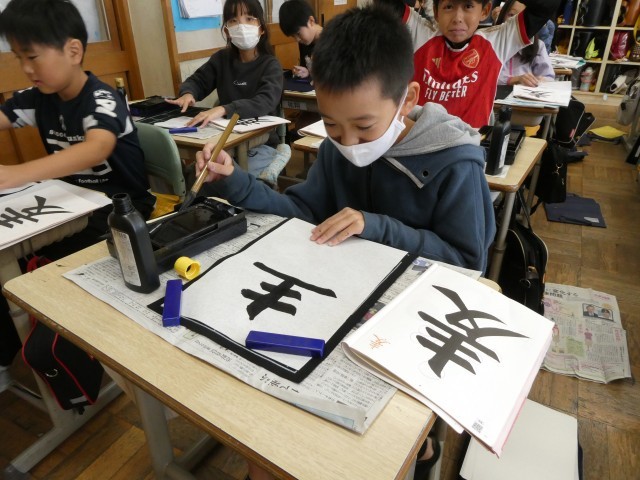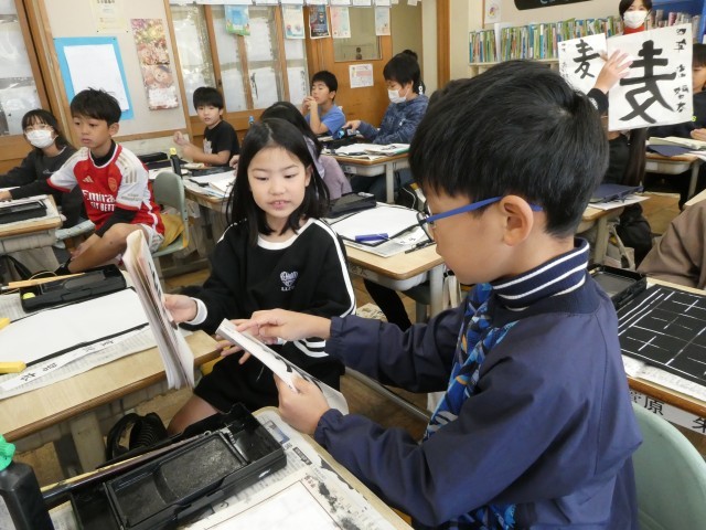 「麦」3つのはらい、特に右払いがむずかしい。上の部分と下の部分の大きさやバランスがむずかしい。一度書いてみて、分かったことを伝え合って、みんなで共有した後、自分のめあてを持って練習に入りました。