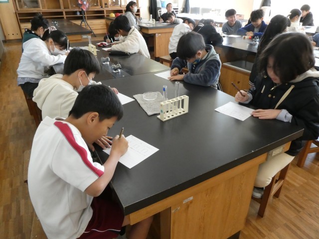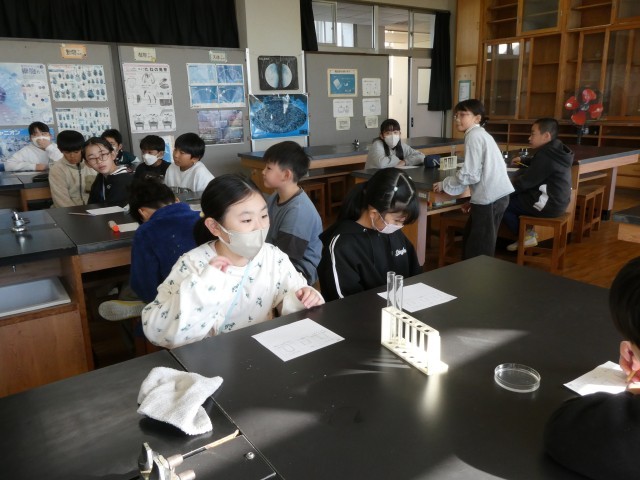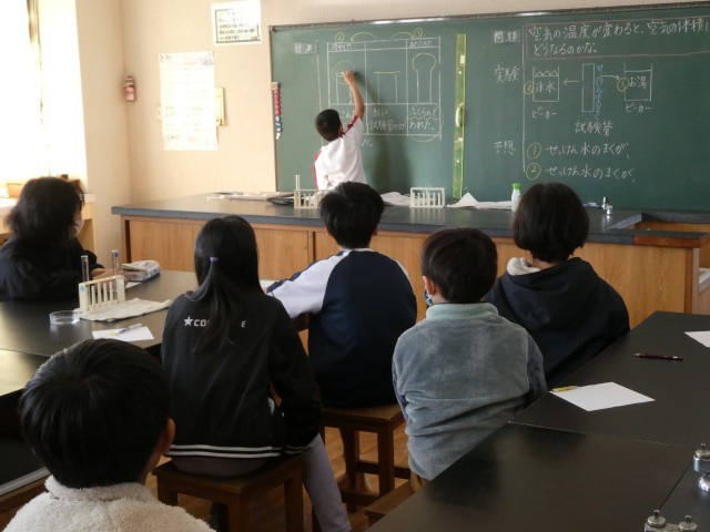 試験管の中の空気を温めたり冷やしたりすると、体積はどうなるのだろうか? 石鹸膜の動きや変化を観察しました。