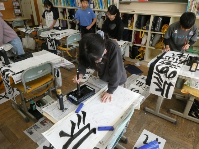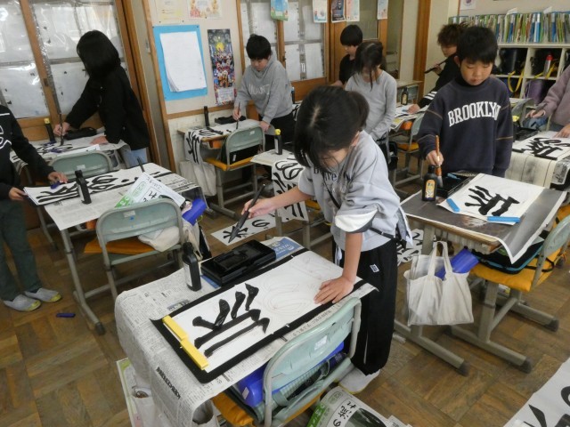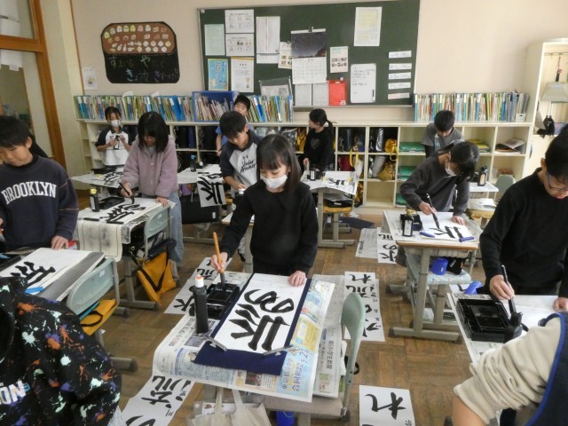 日本の伝統を受け継ごう! ということで、書き初め練習中です。4年生は「水の流れ」と書きます。