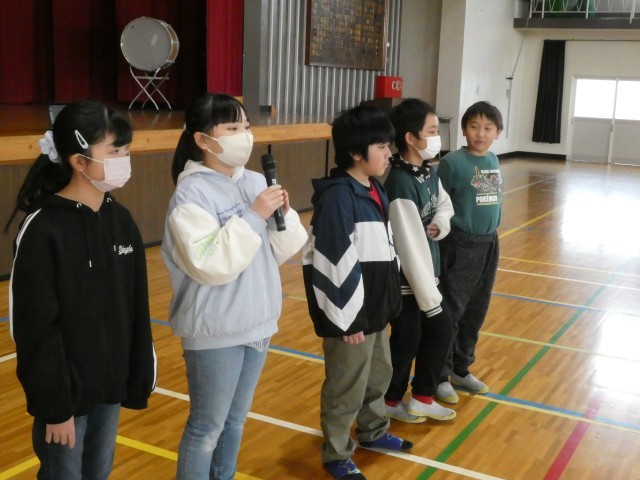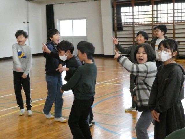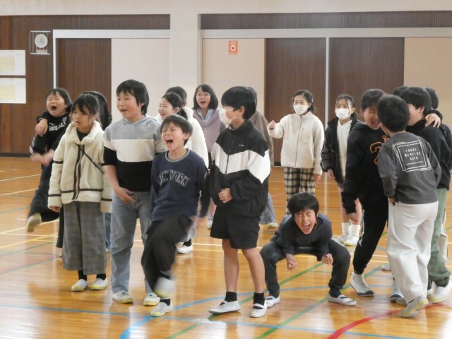 猛獣狩りゲームをしました。進行役の子が大きな声で盛り上げます。最初は分かれていた1組、2組も少しずつ混ざっていきます。