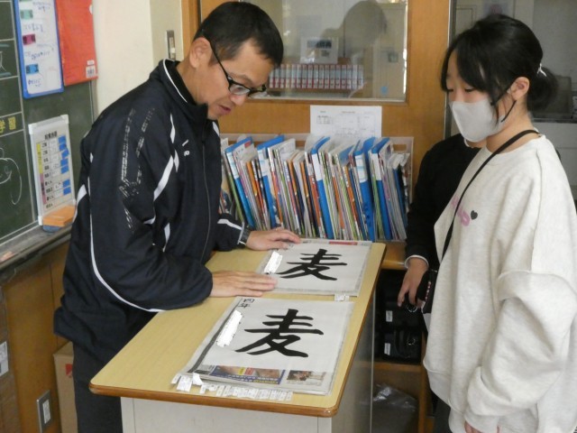 「麦」左右のはらいとその長さやバランスがむずかしい題字です。今日は清書なので、何枚か書いた中から一番上手なものを選んで提出します。