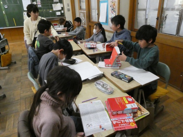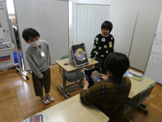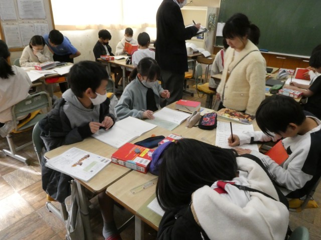 「星や月」の学習です。月の位置を記録するために、自分の腕を使って角度を測る方法を動画で確かめていました。空気が澄んでいる冬の空、暖かくして月や星の観察をしてほしいと思います。