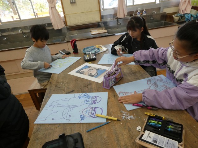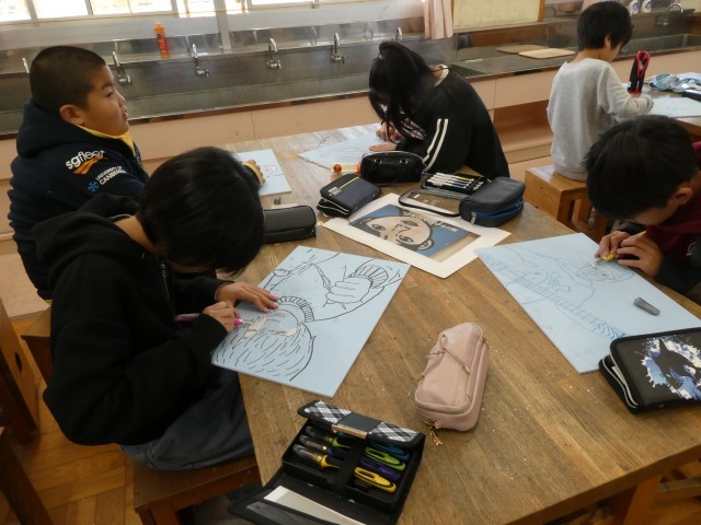 版画の制作に入りました。まずは写真をカーボン紙で板に写しています。次の時間からは、彫刻刀を使います。保護者見守りボランティアの方々、ありがとうございます。