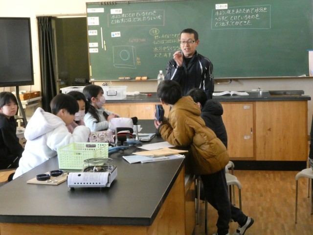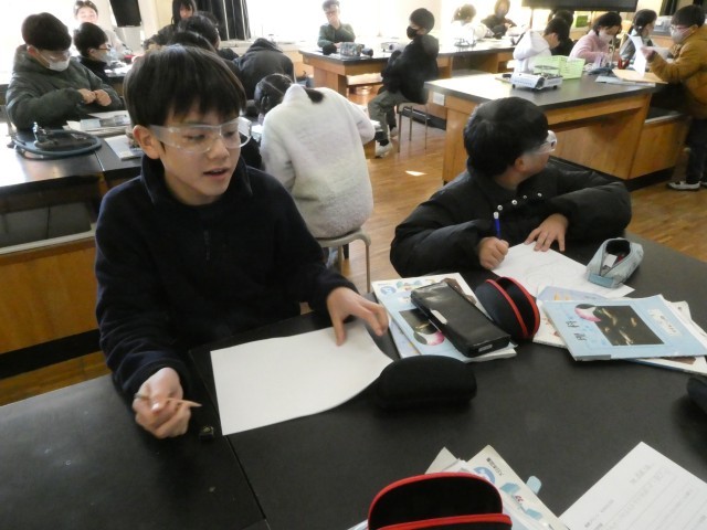 食塩とミョウバンを溶かした水溶液を熱して、水を蒸発させると・・・? 水に溶けていた食塩とミョウバンが姿を現しました。実験観察カードに結果を記入しています。