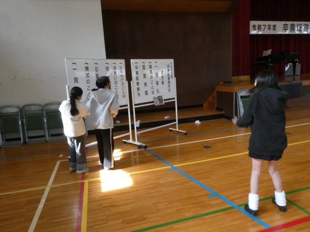 5時間目に5年生と職員で、明日の卒業式の準備をしました。分担場所をきれいにしたり、飾り付けたり、時間いっぱい粘りく働く姿に、最上級生になるという自覚を感じました。卒業生にも5年生の頑張りが伝わることと思います。