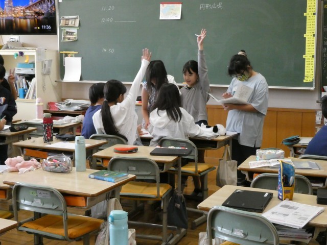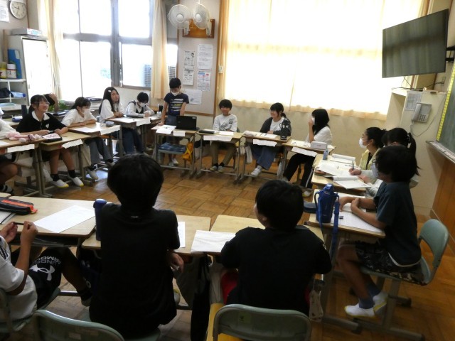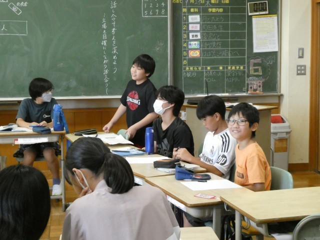 「立場を決めて話し合う」学習です。実際に、「給食の時間は現状のままでよいか、長くした方がよいか」というテーマで話合いをしていました。