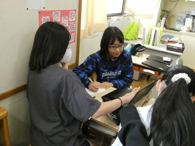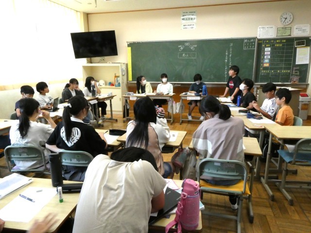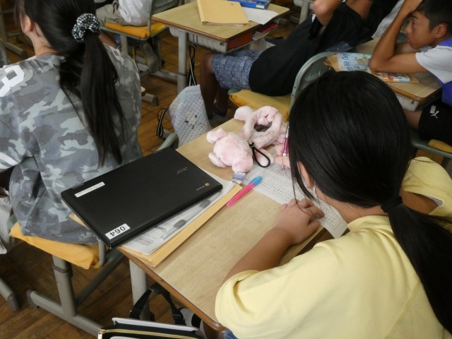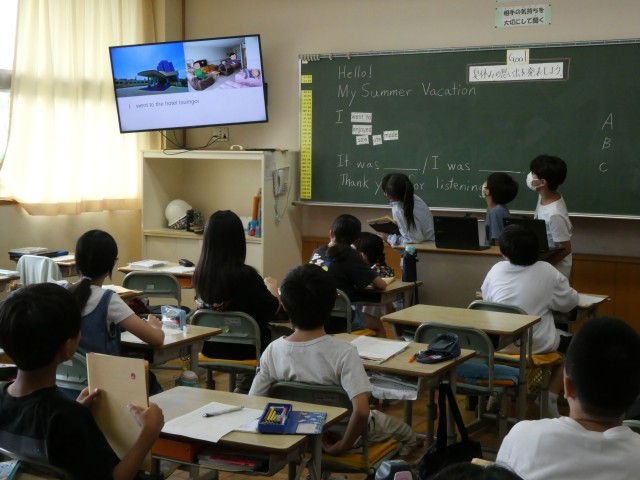 『My summer vacation』夏休みの思い出を英語で発表しました。友達の発表を評価しながら聞いています。