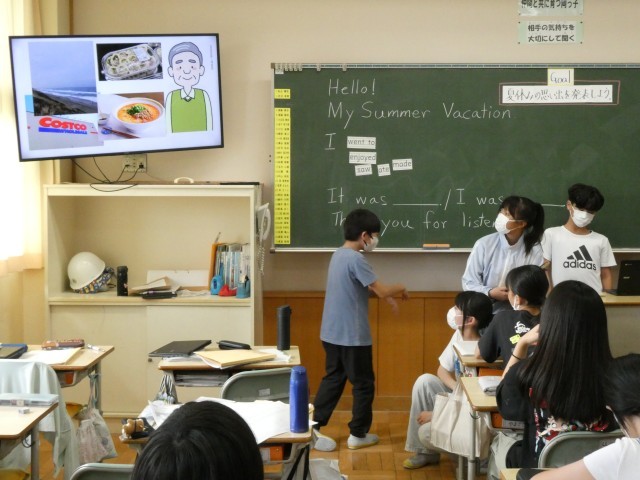 感想を尋ね合う言い方を学習しました。What did you do in summer?   I went to ~. It was existing. 聞いたり話したりして慣れていきます。