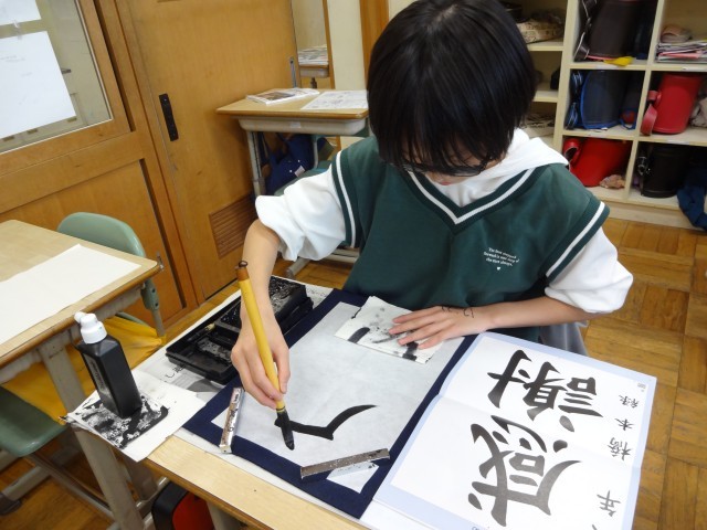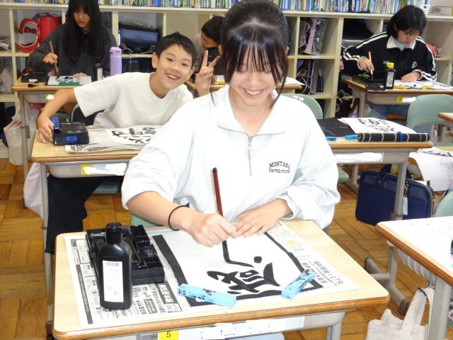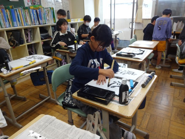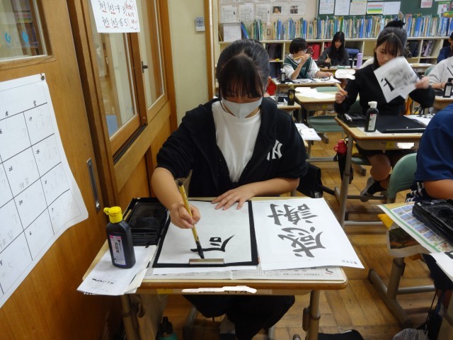 6年 6年書写の時間です。 席書コンクール「感謝」の字を練習中です。 背筋を伸ばして、集中して一文字一文字筆で書いていきます。 +1